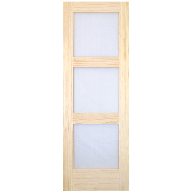Modernize your interior decor using this Metrie 3-panel pine French door. With a natural light brown colour, it complements your home’s aesthetics. Its unfinished surfaces readily accept varnish, paints and stains to enable you to match or accent your specific theme colours. Designed with three glass inserts, this interior French door adds contemporary elements to your living spaces. It comes with sandblasted glass panels that obscure images for increased privacy. Manufactured from tough wood and glass materials, the 1 3/8-inch thick natural pine French door is durable. It resists accidental cracks and warps to support installation in high-traffic areas. Made from lightweight materials, the 28 in W x 80 in H door applies minimal stress on hinges for increased longevity. This product comes with a 1-year limited warranty.